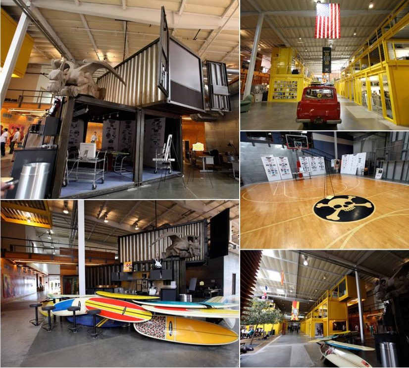 克萊夫.威金森主持設計的TBWA/Chiat/Day 公司具有全新的出發點——對社區的回歸。TBWA/Chiat/Day 公司由工業區的一所舊式工業倉庫改造而成。內部辦公空間設計意在營造出一個完全城市化的鄰里環境, 它擁有綠色開放空間、標志性建筑物、清晰的鄰里分區以及共享的娛樂設施等等城市元素。一條把首層空間一分為二的“主街”、一個行列狀種植橡膠樹和布置座椅的“中央公園”構成了整座辦公區的主要城市特征。公司不同的辦公區、會議區、休閑場所通過“主街”相聯系。明黃色的被稱之為“懸崖住所”的辦公單元十分醒目,“懸崖住所”辦公區內設有一系列的夾層空間,主要用于臨時會議、圖書資料閱覽、咖啡廳等用途。團隊設計室布置在從天花板懸垂下來的巨大膜結構里,這些膜結構如同海船的風帆一般。這些膜結構是為項目小組討論或者臨時的私人會談而設計的。辦公區內設置有籃球場、咖啡廳等社區化的休閑空間,滿足員工工作之余的娛樂要求。TBWA/Chiat/Day 公司的設計打破傳統的辦公空間格局,建立了新的辦公空間秩序,這是一個為適應社會發展而進行的一項超前的實踐活動,是設計師隨著社會發展鼓勵員工之間的交往和更加關注空間使用者的精神需求的表現。